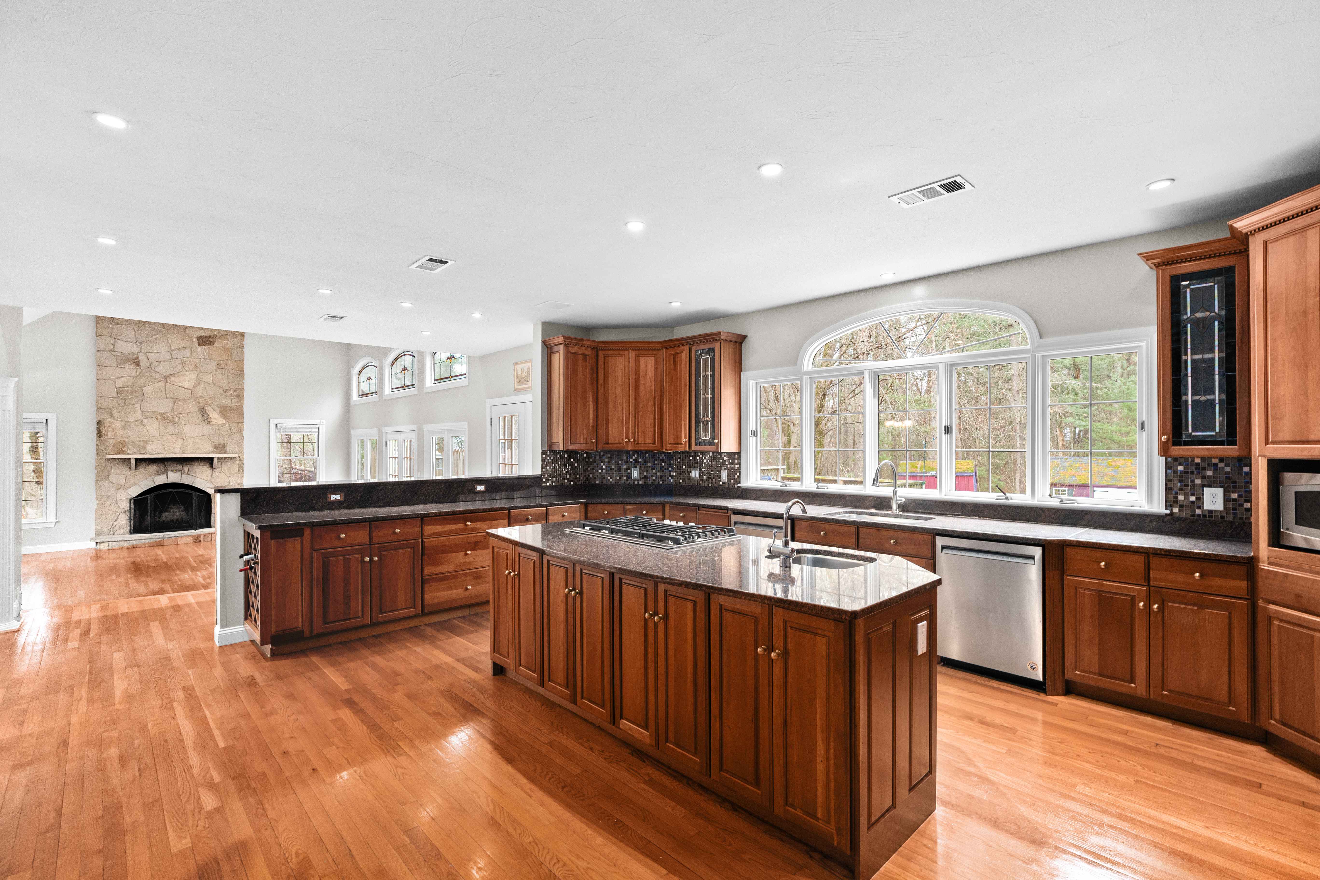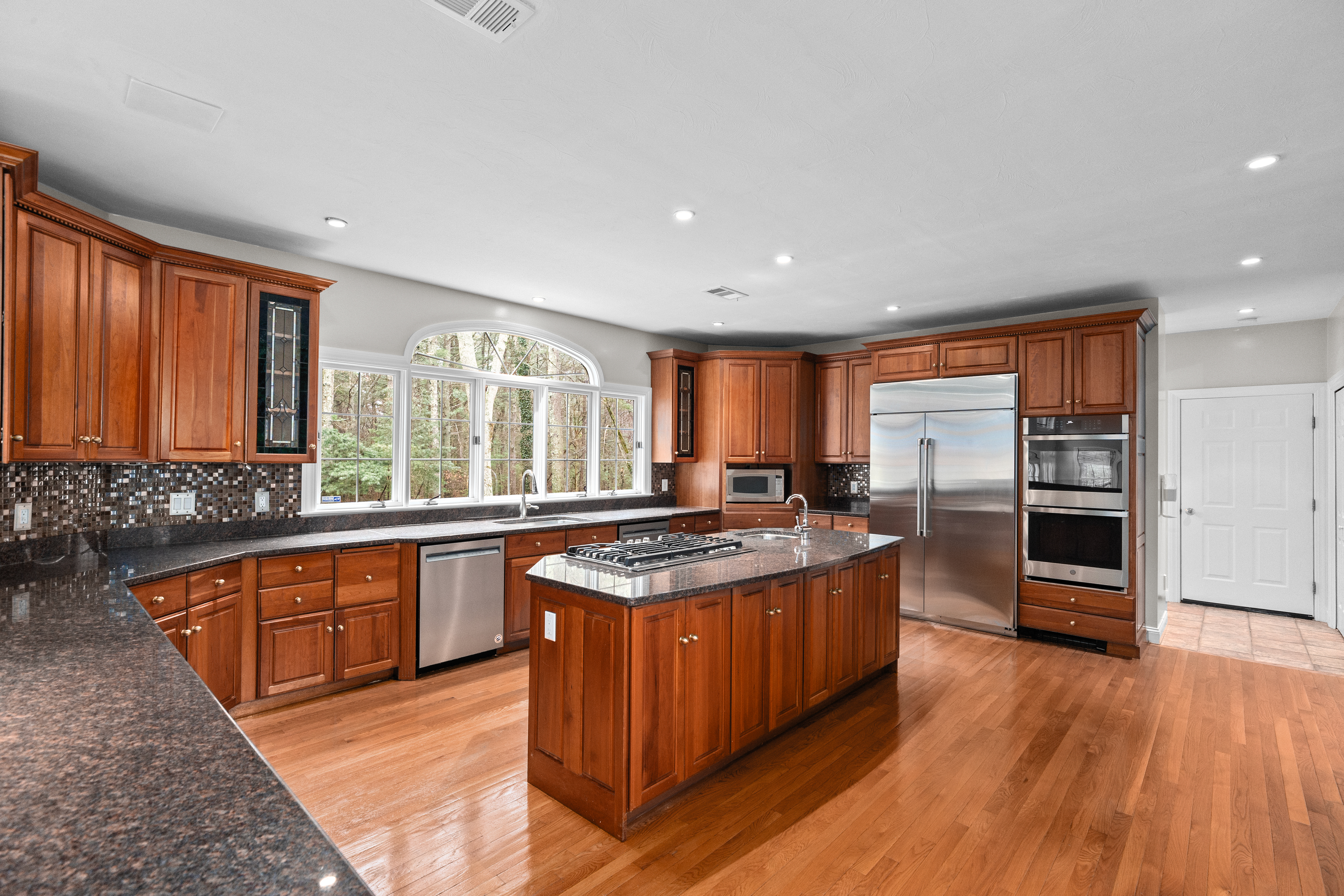 • The chef’s kitchen includes granite countertops, cherry cabinets, oversized fridge, gas cooking, double dishwashers, and wall ovens