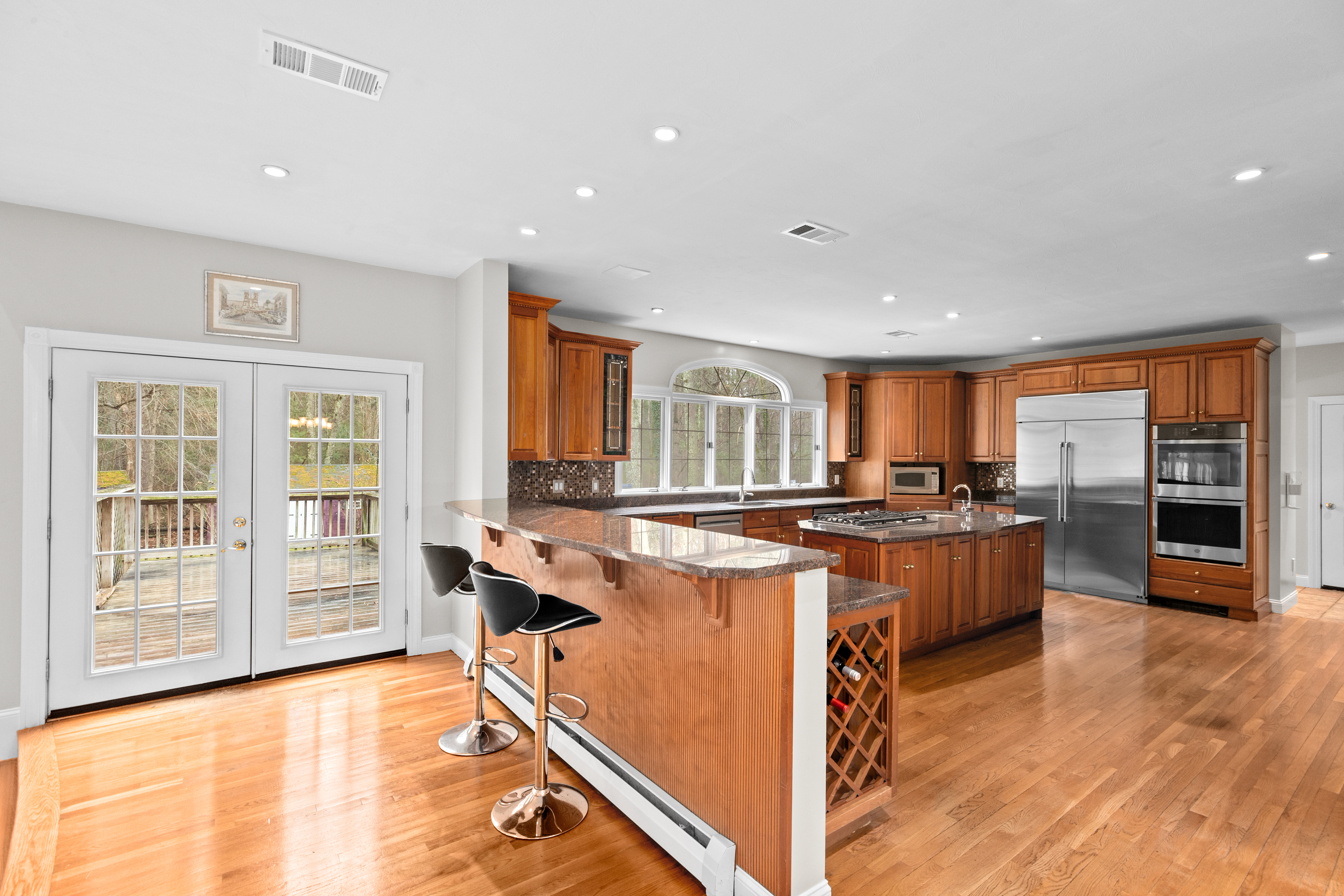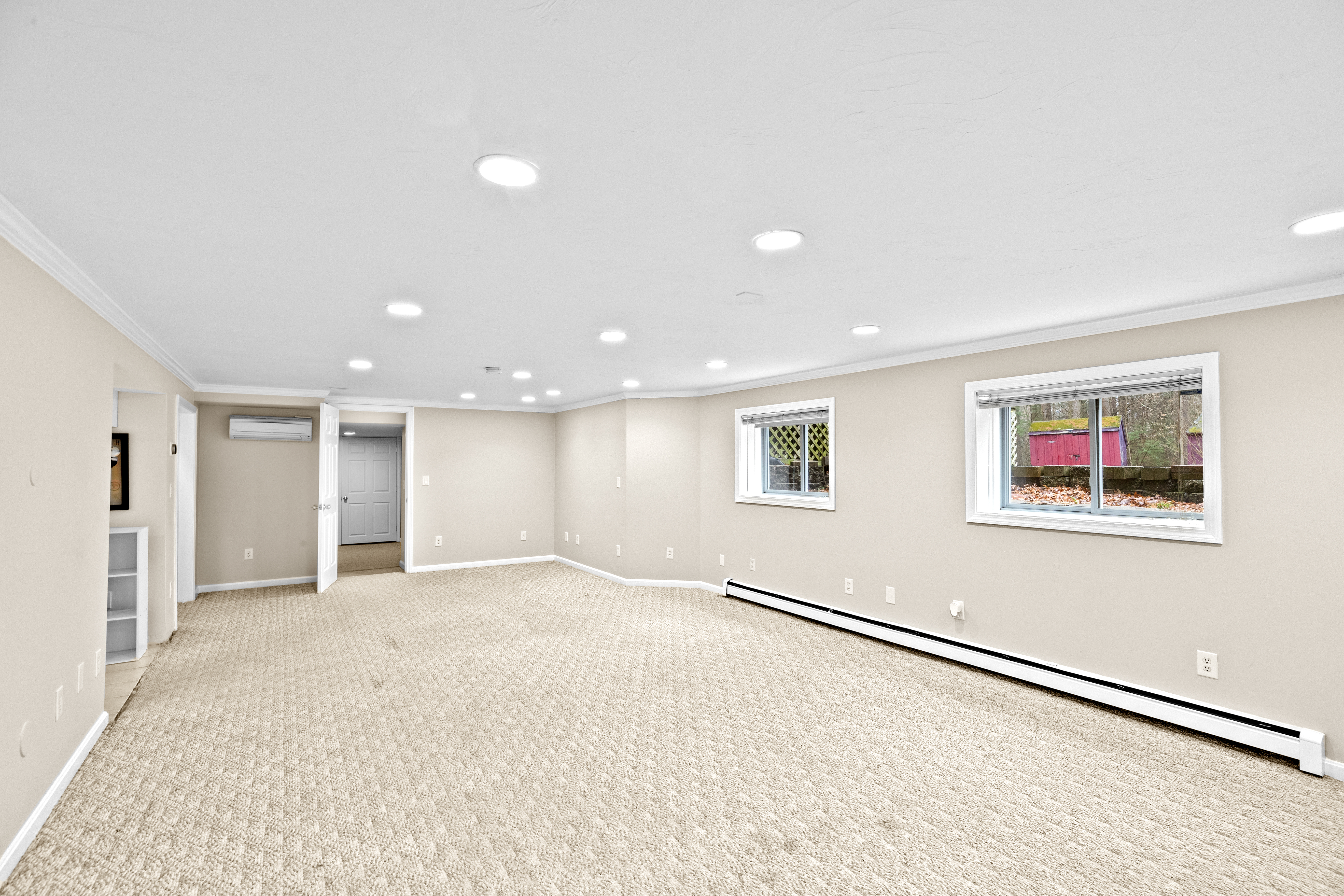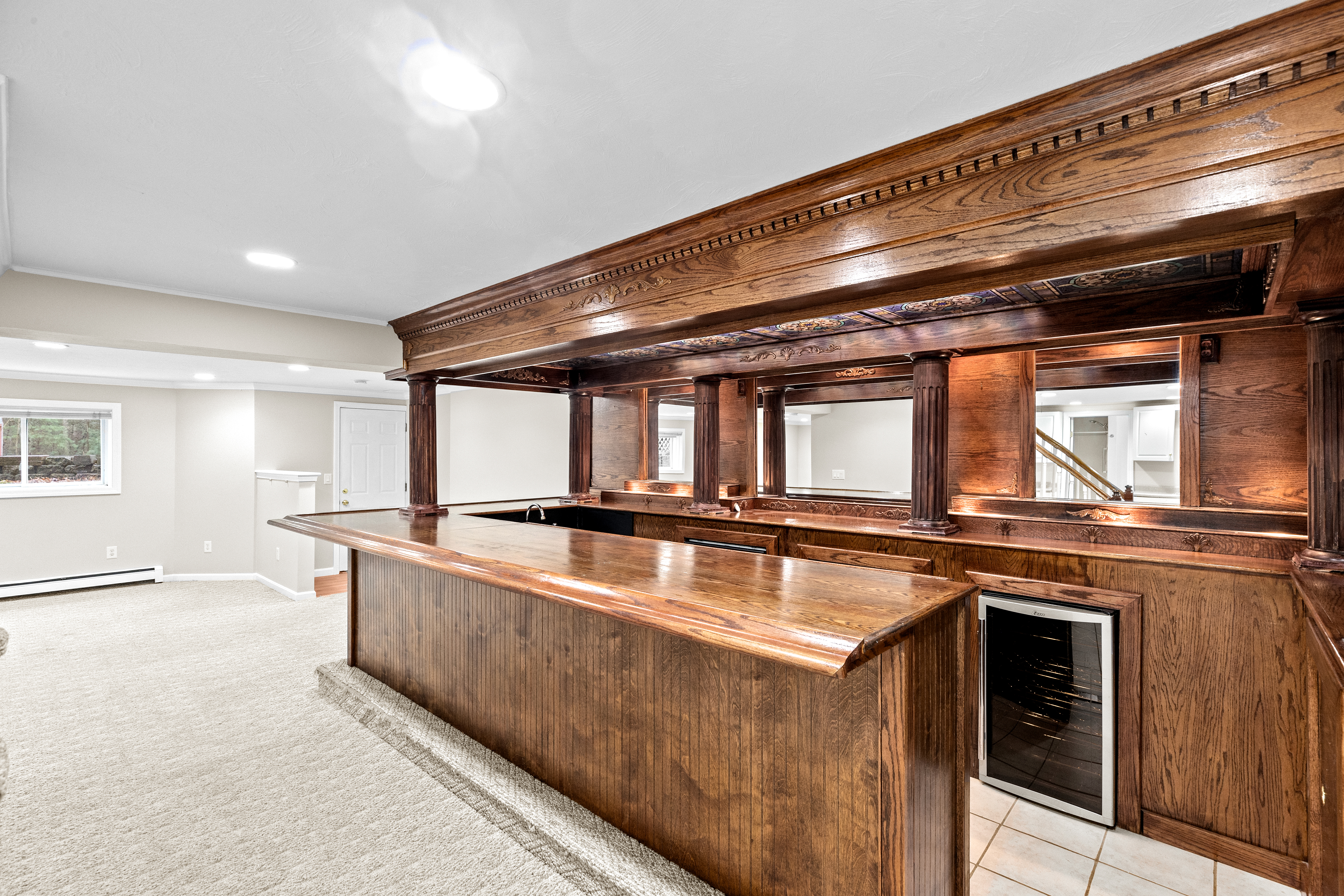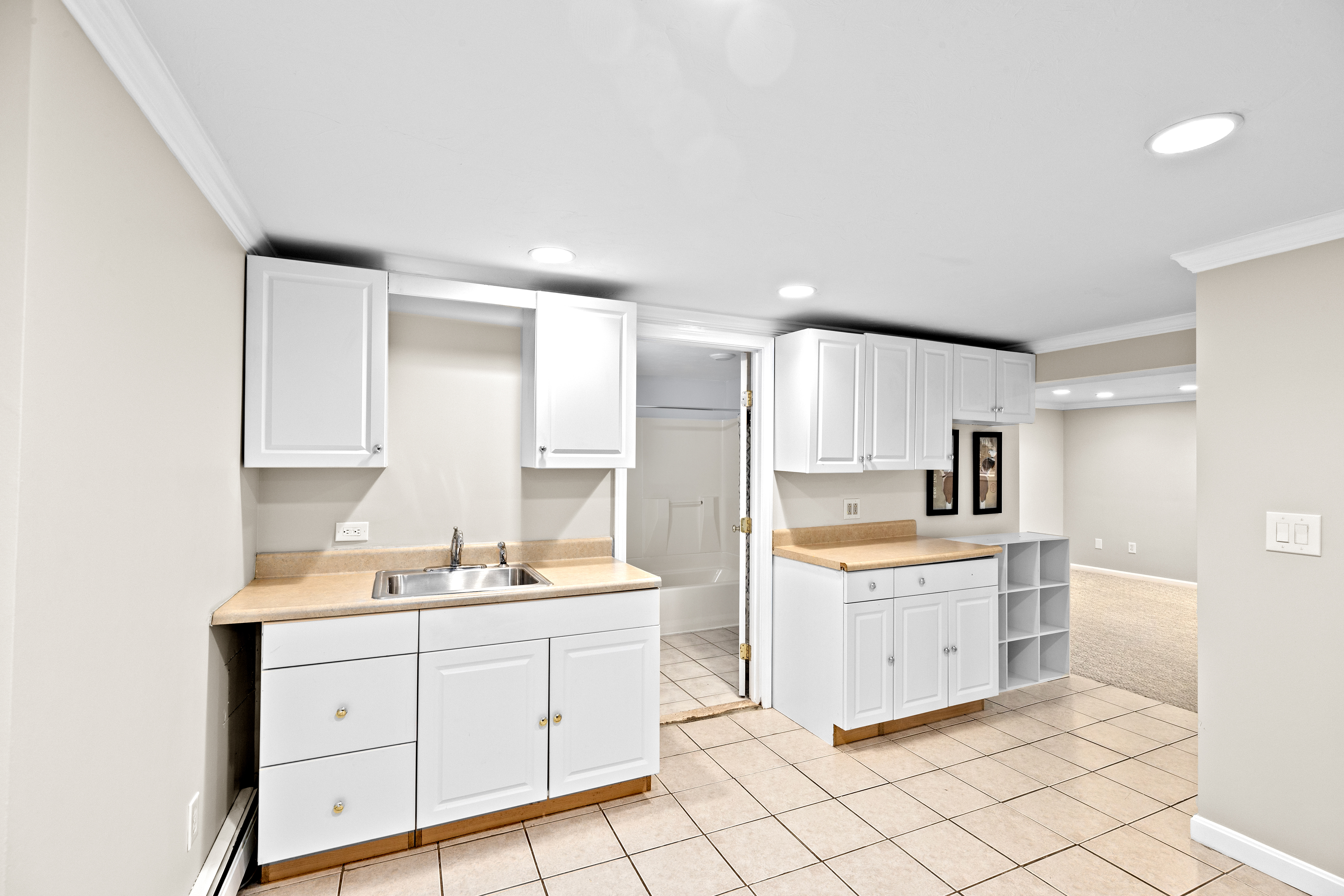 • The finished lower level includes bonus rooms, a full bath, kitchenette, laundry hookups, and an English-style wet bar